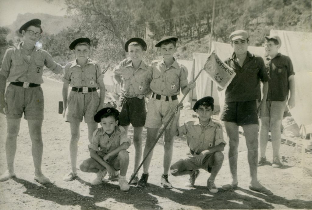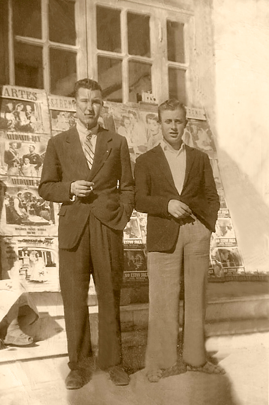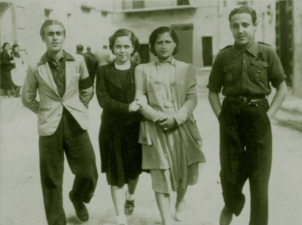 El chico situado a la izquierda lleva un brazalete en señal de luto; el chico de la derecha va vestido de falangista.