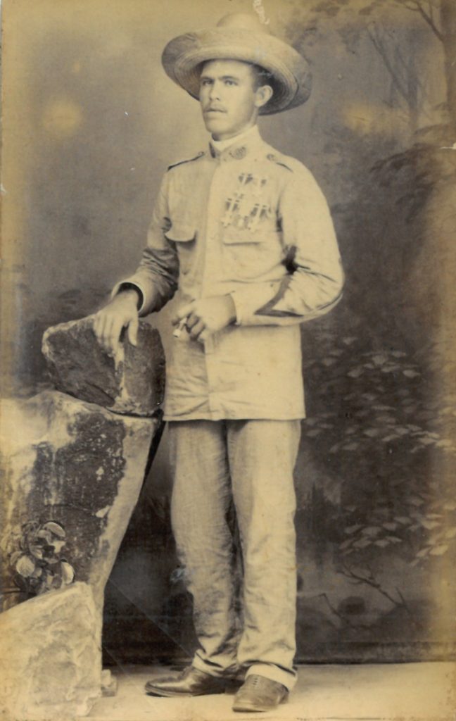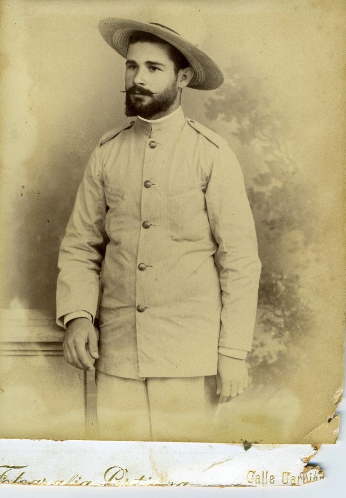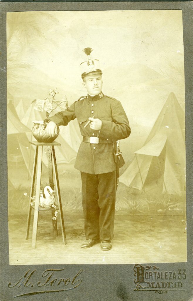 Típica foto de estudio que el recluta se hacía para la familia, con el uniforme tropical de la guerra de Cuba.