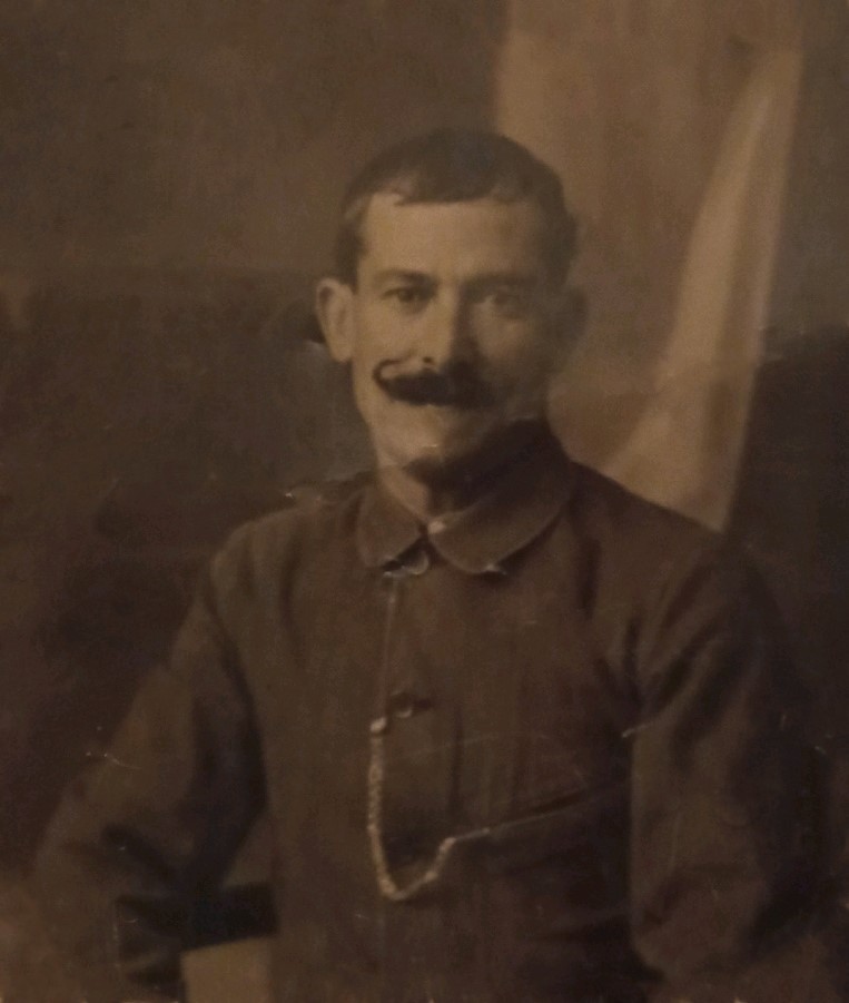 Detalle de un soldado con mostacho (típico de la época), y la cadena de plata del reloj de bolsillo colgando de la camisa.