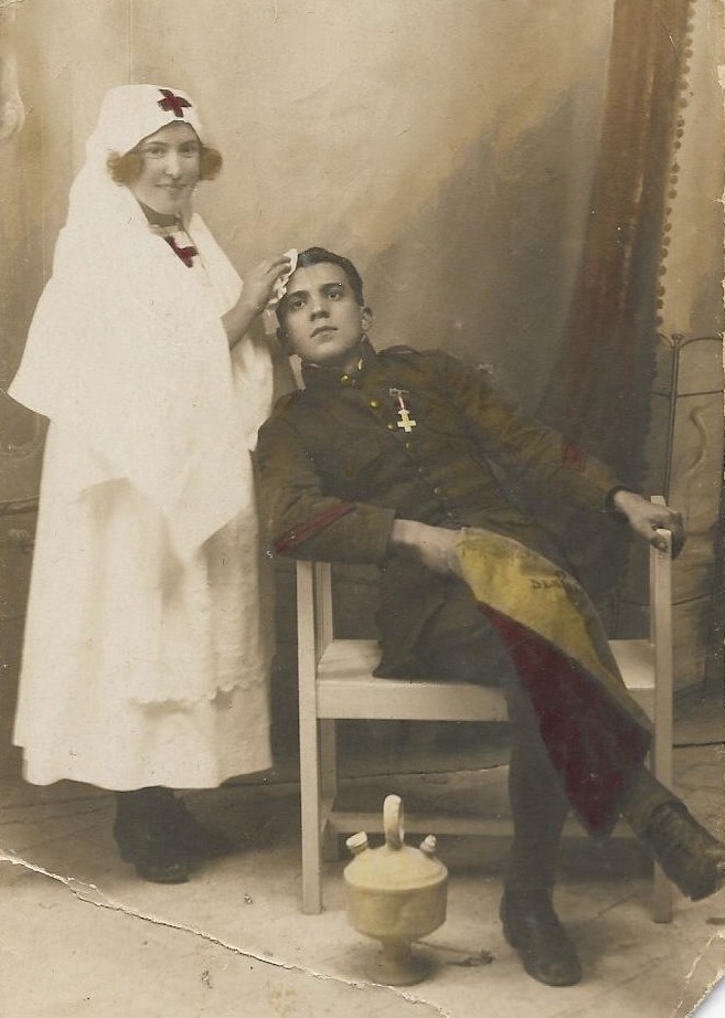 Una pose fingida: el soldado herido con la bandera, y un curioso botijo a los pies, es atendido por una solícita y sonriente enfermera.