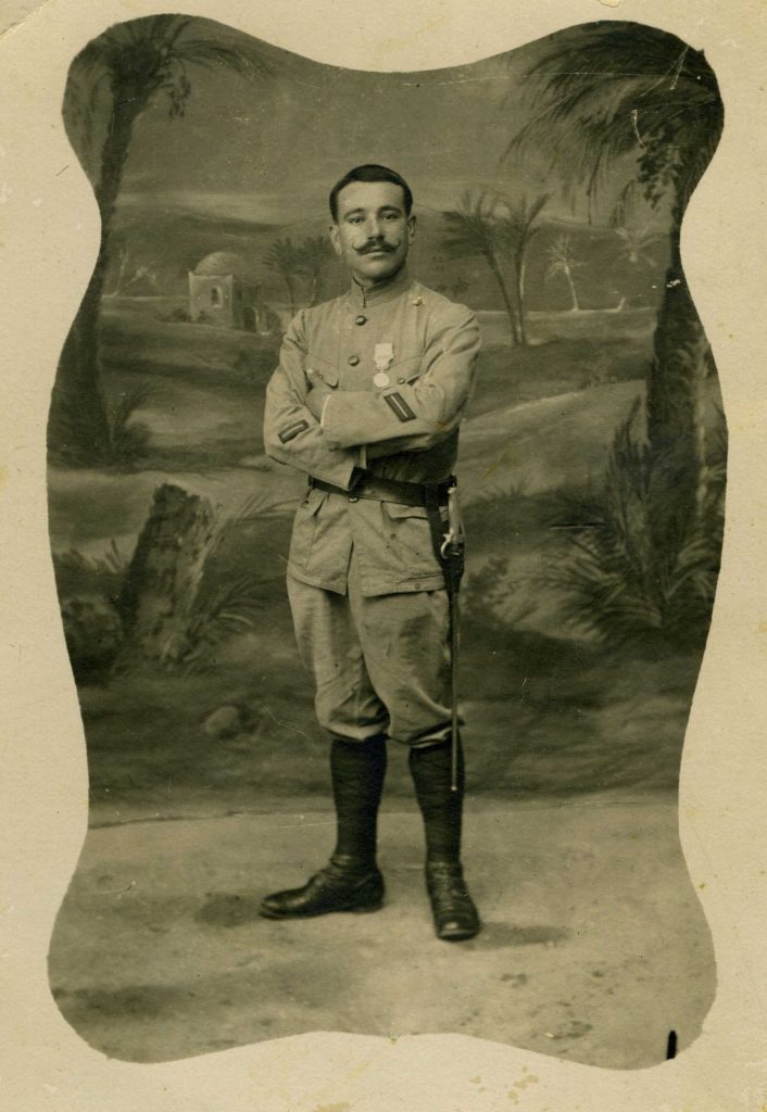 Pose marcial de un soldado con un telón de fondo simulando el Norte de África.