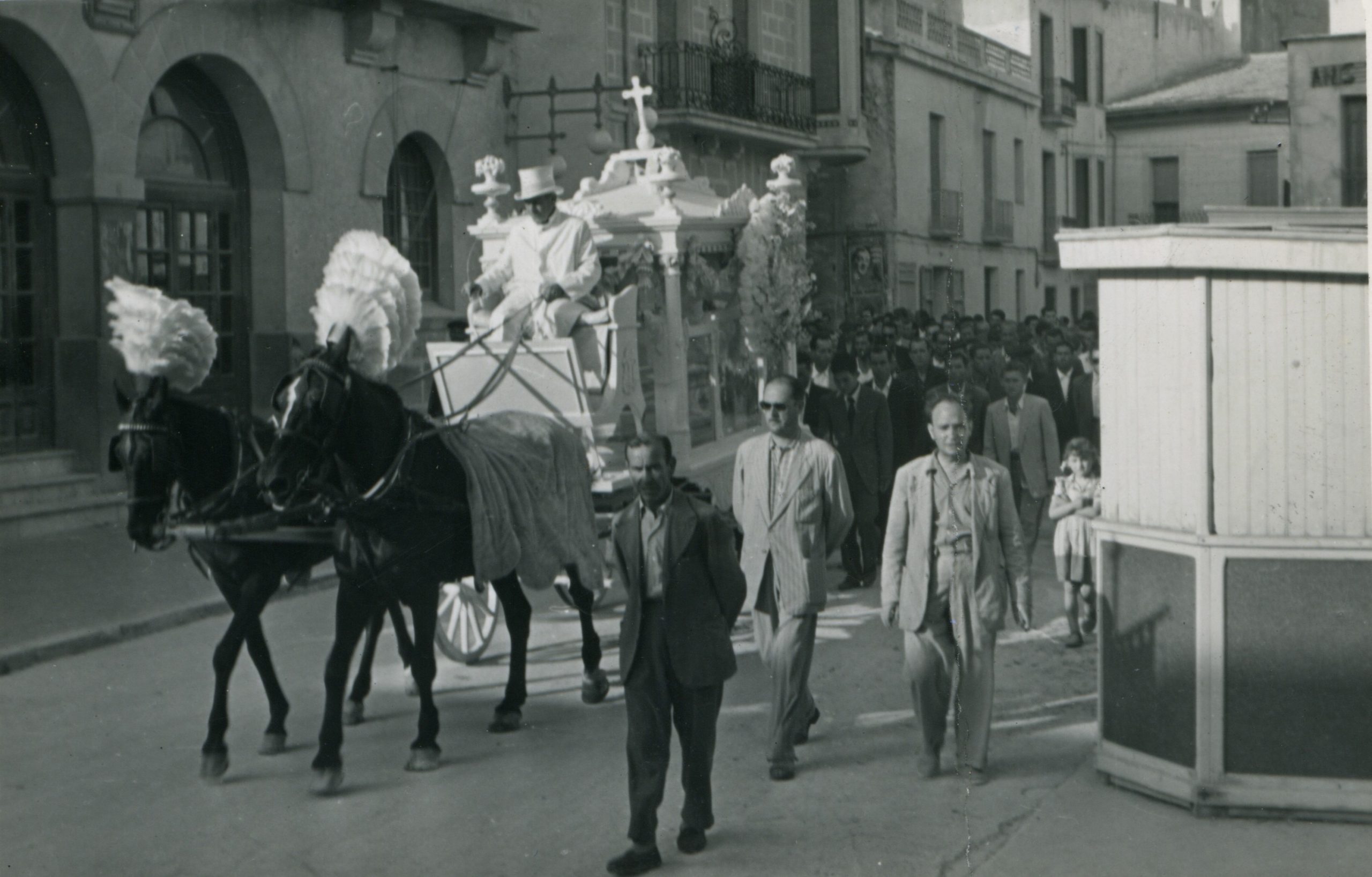 El número de caballos, dos o más, dependía de la categoría de la persona, pero normalmente era de dos. Según las fotos que nos han proporcionado, había tres coches fúnebres, con diferente grado de ornamentación. Si el entierro era de un mortitxol, era todo de color blanco: el féretro, las flores, la carroza, la vestimenta del conductor y la guarnición o adornos de los caballos. Las cintas blancas de las coronas las llevaban los niños y niñas que participaban en el funeral.